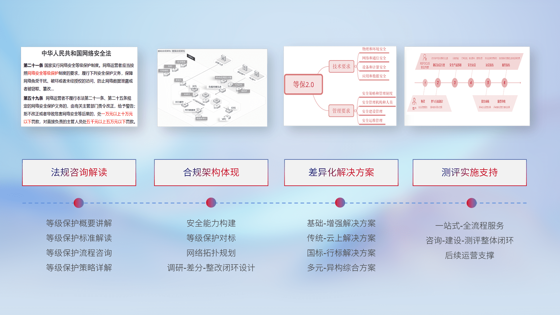 通过专业的法律咨询解读、、合规架构体现、、、、差异化解决方案、、、测试实施支持等服务,,,为客户量身打造等保合规体系。。。。